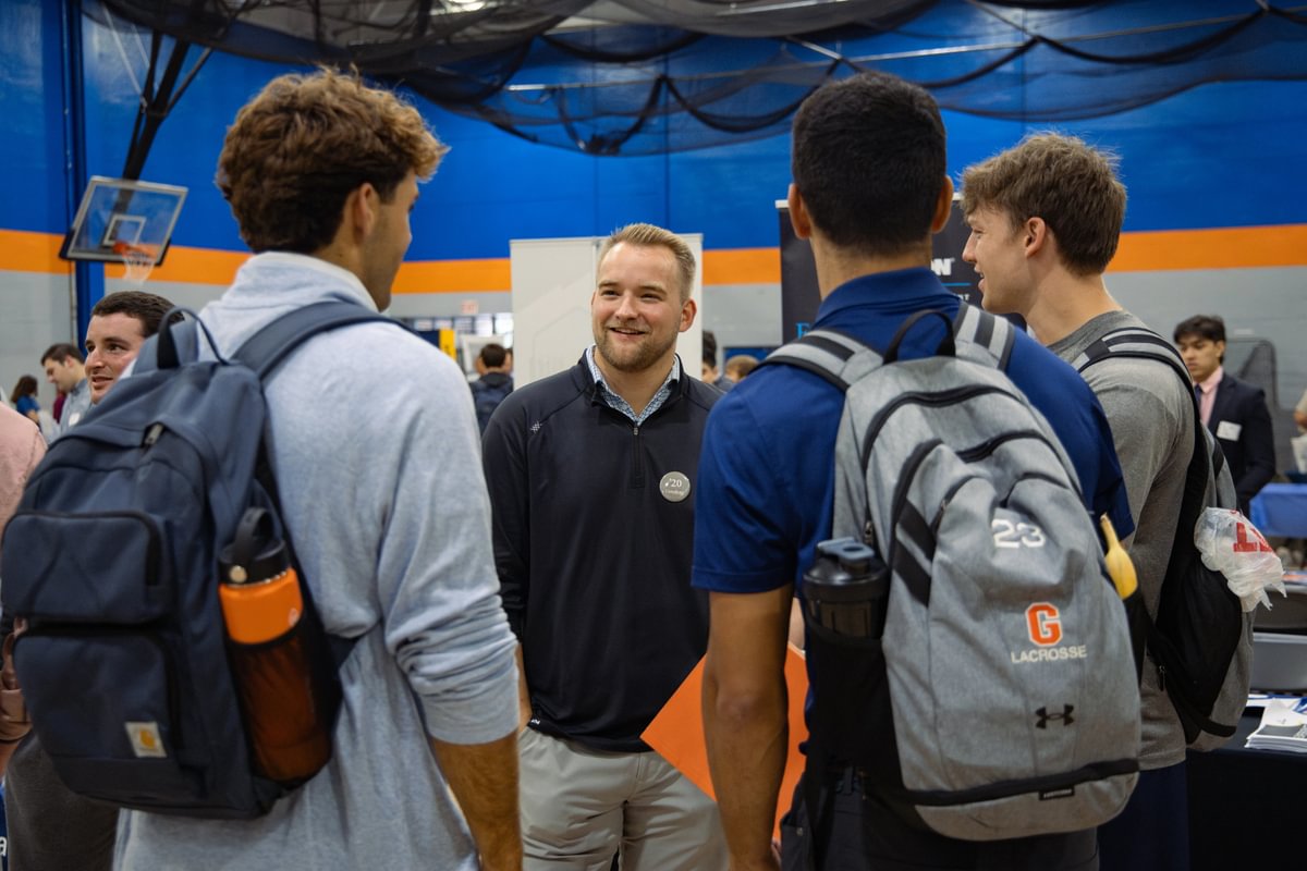 Connor Hunt ’20, an associate client executive at Lockton, speaks to Gettysburg students during the Job and Internship Fair held on campus last fall.