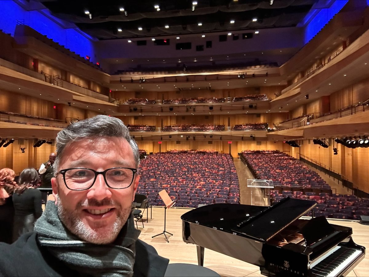 Sunderman Conservatory of Music Prof. César Leal stands on stage at the Lincoln Center for the Performing Arts in New York City.